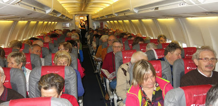 Après un enregistrement et des contrôles de sécurité (il est vrai un peu long), nous nous retrouvons dans un avion rien que pour le groupe.